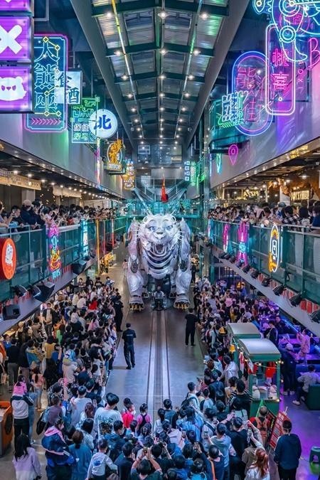 熊洞街是一個(gè)由4800平方米廢棄工業(yè)廠房改造的沉浸式IP樂園,樂園里有巨獸巡游、時(shí)尚文創(chuàng)、科技研學(xué)、特色美食等元素,用文化、科技、藝術(shù)結(jié)合的方式,打造了一個(gè)“尖叫地標(biāo)”,并通過“巨熊北北”這個(gè)超級IP,把文旅和商業(yè)業(yè)態(tài)有機(jī)融合在一起。