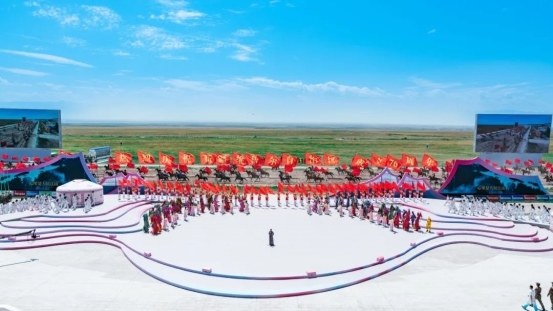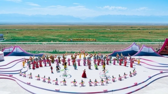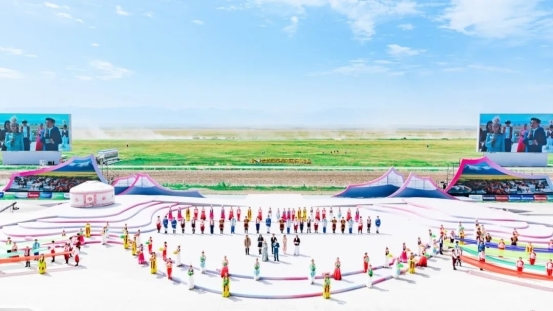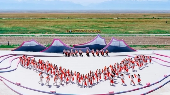 開幕式尾聲中,全體演員深情合唱《歌唱祖國》。同時,氣勢恢宏的“萬馬奔騰”表演在喀爾坎特草原激情上演,將整場演出再度推向高潮。