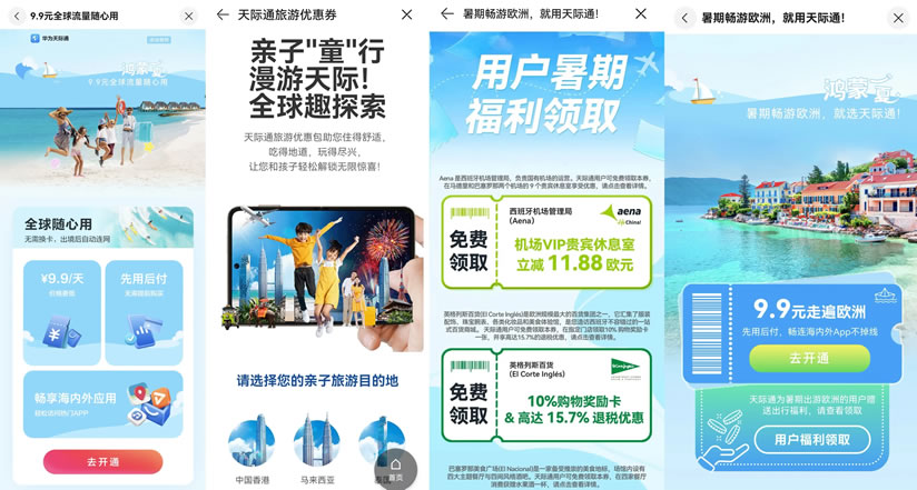 暑期,天際通為計劃出境游的用戶特別推出了“全球隨心用”活動,境外流量9.9元包天,每天有5GB高速流量,活動覆蓋港澳、新馬泰、日韓、歐洲、澳大利亞、美國(本土地區(qū))等50個國家地區(qū),多重優(yōu)惠讓境外出行更劃算。華為天際通還為出行亞洲、歐洲的用戶提供了多地旅游優(yōu)惠權(quán)益,涵蓋機(jī)票酒店、旅游景點(diǎn)、吃喝玩樂等各個方面,更多精彩等你來發(fā)現(xiàn)!
