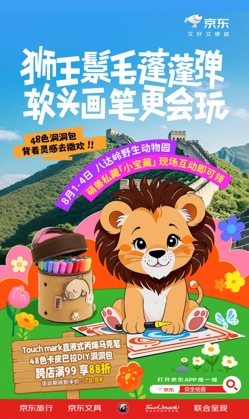 如今暑假期間帶孩子打卡動(dòng)物園和大自然互動(dòng)成為了出游的首選,作為中國(guó)最大的山地野生動(dòng)物園,北京八達(dá)嶺野生動(dòng)物園匯集了世界各地的眾多代表性動(dòng)物,非常適合激發(fā)孩子的創(chuàng)作靈感,在運(yùn)用中掌握繪畫技能。在8月2日至3日,京東攜手八達(dá)嶺野生動(dòng)物園帶來(lái)“猛獸開(kāi)路 人類穩(wěn)住”文具快閃活動(dòng),活動(dòng)期間京東將安排特色籠車在園區(qū)游覽,為親子游客帶來(lái)有趣有料的繪畫體驗(yàn),游客完成互動(dòng)集章還能領(lǐng)取精美禮包,F(xiàn)場(chǎng),京東文具攜手青竹畫材、Touchmark、輝柏嘉等知名品牌設(shè)置了產(chǎn)品展示區(qū),游客可上手品鑒京東甄選的安全無(wú)毒繪畫文具,掃碼下單還能享受豐厚優(yōu)惠,福利多多。想要和孩子體驗(yàn)一場(chǎng)別開(kāi)生面的繪畫創(chuàng)作,那就記得鎖定京東的這次快閃活動(dòng)。同時(shí),京東還打造“寶藏文具周”線上會(huì)場(chǎng),為消費(fèi)者帶來(lái)寶藏文具推薦,搜索“安全繪畫”一鍵直達(dá)暑假寶藏文具周·靈感周會(huì)場(chǎng),安全無(wú)毒隨意畫,親膚水洗真放心。