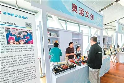 設在張家口市崇禮區(qū)國家跳臺滑雪中心內的非遺手工藝品展臺。