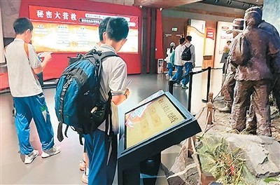 游客步入館內(nèi),仿佛踏入歷史的洪流。全息投影、文物陳列、場景復原等技術(shù)打造出數(shù)字化展陳空間。曾經(jīng)只能在文字和圖片中描繪的歷史場景,如今栩栩如生地呈現(xiàn)在眼前。在秘密大營救展區(qū),雕塑還原文化名人在游擊隊員護送下離開的場景,當觀眾點擊多媒體互動裝置選擇不同的撤退路線時,大屏幕會動態(tài)還原當時驚險的轉(zhuǎn)移路徑,讓人如同身在其中,真切感受到革命先輩在槍林彈雨中的英勇機智。來自廣州的黃同學說:“有了這些多媒體設(shè)備,讓我更直觀了解到當時槍林彈雨的危險場景,也更好地學習了東江縱隊的歷史。”