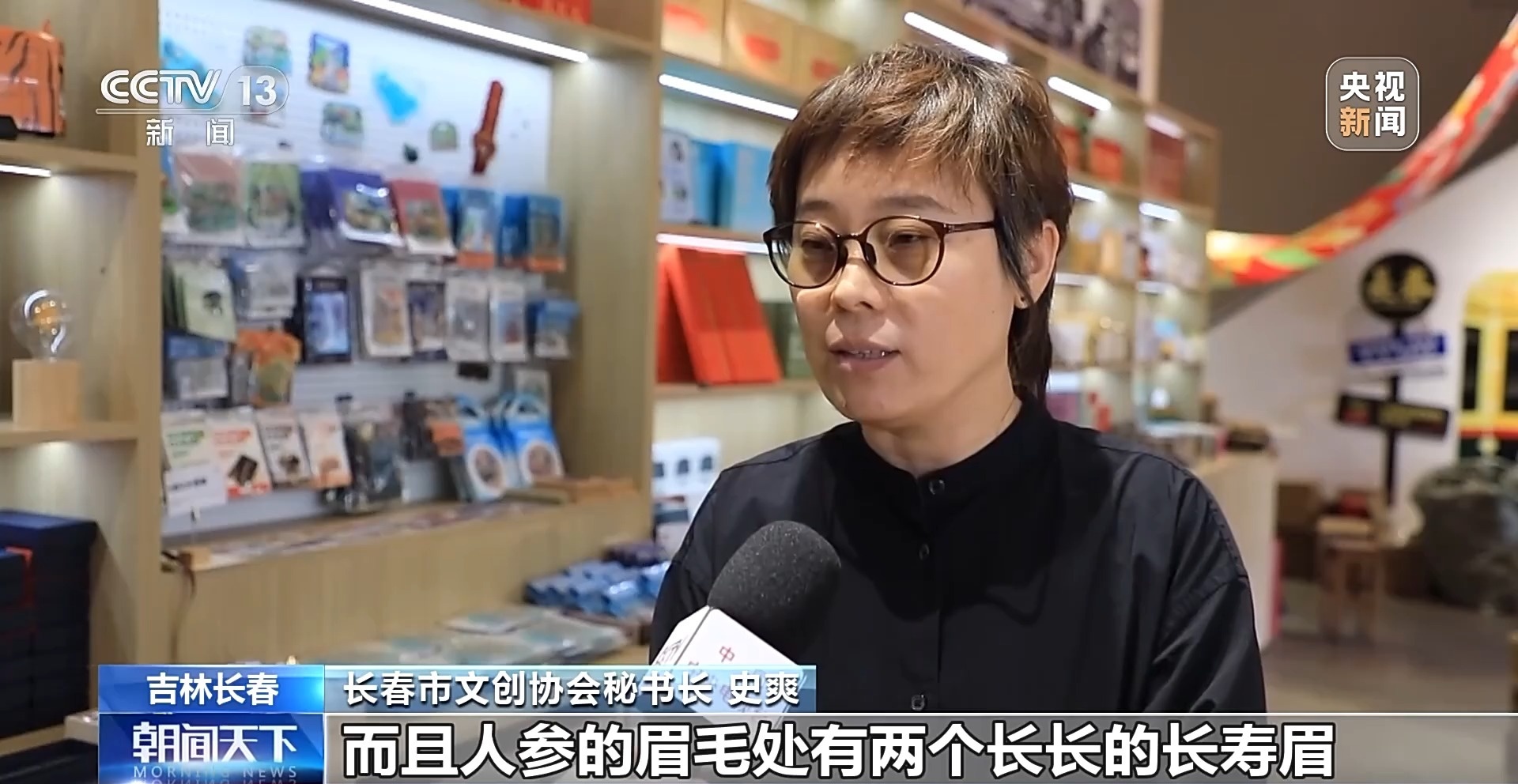 長春市文創(chuàng)協(xié)會秘書長 史爽:因?yàn)槲覀兗质∈侨藚⒌闹饕a(chǎn)地,上面的紅圍脖結(jié)合了我們原有的人參典故,系紅繩的這樣的一個(gè)典故,而且人參的這眉毛處有兩條長長的長壽眉,象征著吉祥如意。