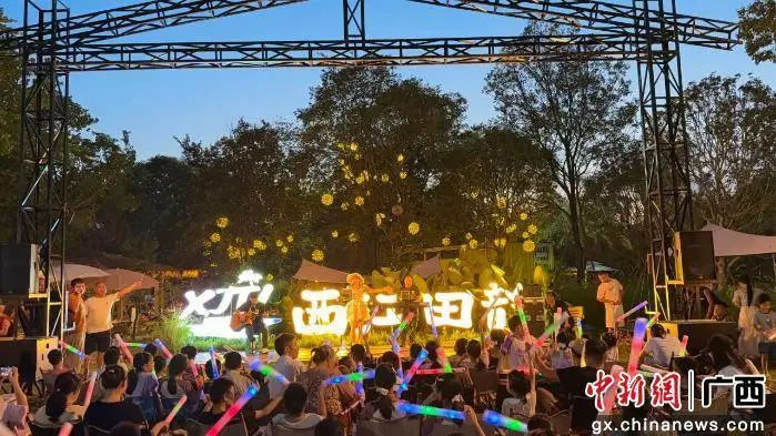 西江田韻休閑營地的草坪音樂會人氣爆棚。每日傍晚,草坪上坐滿游客,主辦方邀請多風格樂隊、歌手現(xiàn)場演出,動感流行曲與舒緩民謠交替響起,旋律在田野間回蕩。游客或鋪野餐墊圍坐,或站在草坪邊緣揮舞熒光棒,隨節(jié)奏輕搖,享受獨特音樂盛宴。