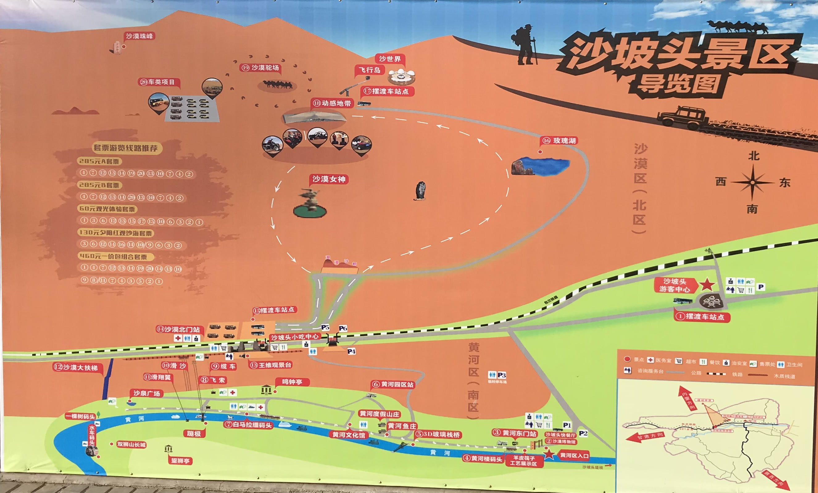 悠悠歲月,由古而今。天賜奇景與人們的不懈創(chuàng)造,使如今的沙坡頭已不是古時(shí)的沙陀頭,它融自然景觀、人文景觀、治沙成果于一體,被世人稱之為“世界沙都”、“世界壟斷性旅游資源”。在這里,“大漠孤煙直,長河落日?qǐng)A”的古詩意境得到最完美的體現(xiàn);滑沙聽鐘,坡底戲泉,物我兩忘,其樂無窮;黃河弄筏,追波逐浪,驚險(xiǎn)刺激;騎駝踏沙,體驗(yàn)沙海輕舟之浩渺,觀大漠日落日出之壯美;觀星賞月,聽沙漠夜聲之神秘;圍篝火,飲酒吃肉,狂歌勁舞,大漠探險(xiǎn)神秘引人;古老的河灣水車,輪轉(zhuǎn)水瀉,澆田灌園,別有情趣;沙下果園,疊翠流紅,鳥語花香,瓜甜果艷,令人流連忘返;“一線牽南北”的雙架索道,可實(shí)現(xiàn)凌空跨河比翼雙飛的夢(mèng)想;古老的黃河木帆船、赤背的纖夫,將“妹妹你坐船頭,哥哥我岸上走”的歌曲變?yōu)楝F(xiàn)實(shí)美的享受;空中飛行、高空跳傘走出影視蒙太奇,飄落沙山;沙雕、沙療、沙浴和沙漠球類、沙漠田徑等形式多樣的“沙”字號(hào)體育健身競技項(xiàng)目,融智慧、趣味、知識(shí)、健身為一體;民族風(fēng)情演出、黃河梨花節(jié)、大漠黃河國際旅游節(jié),形式新穎,內(nèi)容獨(dú)特。將在5月4日舉行的大漠舞龍大賽,百余條巨龍?jiān)诤棋尿v格里大漠騰滾翻飛,場(chǎng)面恢宏,氣勢(shì)雄偉,鑼鼓震天,令人心動(dòng)……這,就是今日之全新的沙坡頭旅游區(qū),2000年被國家評(píng)定為AAAA級(jí)旅游區(qū),它是寧夏人之驕傲,是馳名中外的旅游勝地。