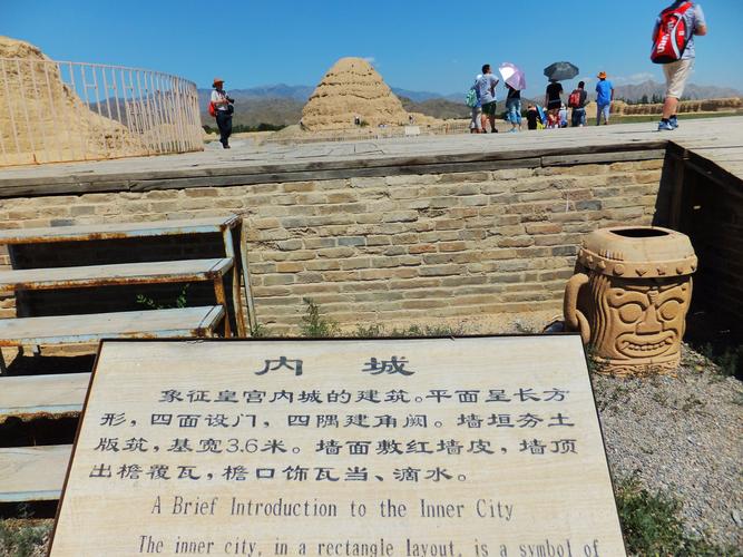月城北側(cè)為內(nèi)城遺址,四面用神墻環(huán)繞,呈南北長(zhǎng)方形,南北長(zhǎng)180米,東西寬160米。占地約40畝。神墻中部較窄,靠近轉(zhuǎn)角漸寬大,純凈黃土分段夯筑而成,中部每段約3米,殘高約3米,比較平齊,各段如須彌座形狀。神墻四處轉(zhuǎn)角皆很高大,類圓柱形,從各轉(zhuǎn)角往神墻兩側(cè),連體圓柱愈來(lái)愈矮小,各有5個(gè),共40個(gè)。其殘存最高達(dá)6米以上,最低的3米,發(fā)現(xiàn)在轉(zhuǎn)角處5個(gè)連體圓柱夯土臺(tái)周?chē)杂写u瓦殘存。內(nèi)城四面神墻皆正中辟門(mén),門(mén)址寬約12米,地面散布瓦片、脊飾殘塊等。根據(jù)統(tǒng)計(jì),內(nèi)城坍塌墻體在2002年時(shí)已達(dá)189.1米,約占?jí)w總長(zhǎng)度的27.8%。南神門(mén)內(nèi)約25米偏西處有一處獻(xiàn)殿遺址。根據(jù)考古發(fā)掘情況看,可能原為一正方形臺(tái)基,臺(tái)面周長(zhǎng)65米,直徑約20米,堆積厚約1米。臺(tái)基以純凈黃土墊起,其上及周?chē)鷼埓娲罅壳啻u灰瓦及琉璃構(gòu)件。獻(xiàn)殿之后約6米為墓道封土,南北長(zhǎng)約42米,呈東南——西北走向,形似魚(yú)脊,以砂石填充。其末端為盜坑,盜坑直徑約20米,深約5米?觾(nèi)長(zhǎng)有若干小樹(shù),兩側(cè)有土堆。內(nèi)城西北隅有一處陵臺(tái),八角形,高約20米,分7級(jí),每級(jí)向內(nèi)收分。陵臺(tái)收分處及周?chē)孛嫔⒉即罅客咂⑼弋?dāng)、滴水等建筑材料。夯土臺(tái)整體形狀為塔形,其上露出一個(gè)個(gè)椽洞,有水平方向的,還有豎斜方向的,證明原來(lái)有椽出頭。距離陵臺(tái)較遠(yuǎn)的四角各有一座角臺(tái),其中東南、西南的兩座角臺(tái)已坍塌,西南角尚可分辨認(rèn)出臺(tái)基,相距約520米。其連線在雙闕臺(tái)之前,北面的2座角臺(tái)相距290米。東北角臺(tái)殘高1米多,坍塌嚴(yán)重,只有西北處的角臺(tái)保存比較完好,殘高約5米,但嚴(yán)重風(fēng)化。北邊兩角臺(tái)相距272米。南北聯(lián)線約460米。夯土臺(tái)因剝蝕已趨圓柱形,底面周長(zhǎng)20米。純凈黃土夯筑,周?chē)⒙渲罅考t褐色板瓦、筒瓦殘片。