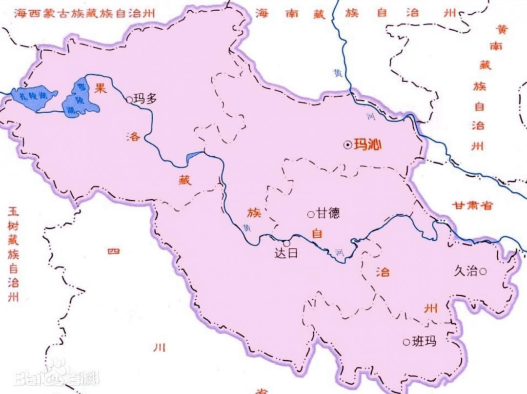 1957年,由甘德縣部分地區(qū)設瑪多縣,駐黃河沿;由達日、甘德2縣部分地區(qū)合并設瑪沁縣,駐中心站(依蓋齊);果洛藏族自治州轄6縣。