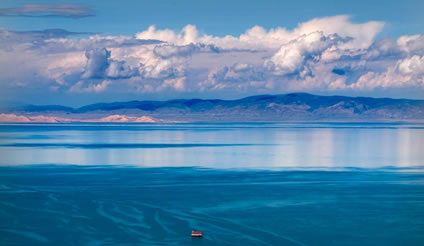 青海省青海湖景區(qū),位于青藏高原的東北部、西寧市西北部、剛察縣南部,距西寧市136公里。青海湖古稱“西!,又稱“仙!薄ⅰ磅r水!薄ⅰ氨昂糖己!,是中國最大的內陸湖、最大的咸水湖。湖面海拔3196米,湖岸線長360公里,面積4583平方公里,湖水冰冷且鹽份很高。湖中有海心山,四周高山環(huán)繞:北面是大通山,東面為日月山,南面是青海南山,西面為橡皮山。湖區(qū)盛夏時節(jié)平均氣溫僅15℃,為天然避暑勝地。