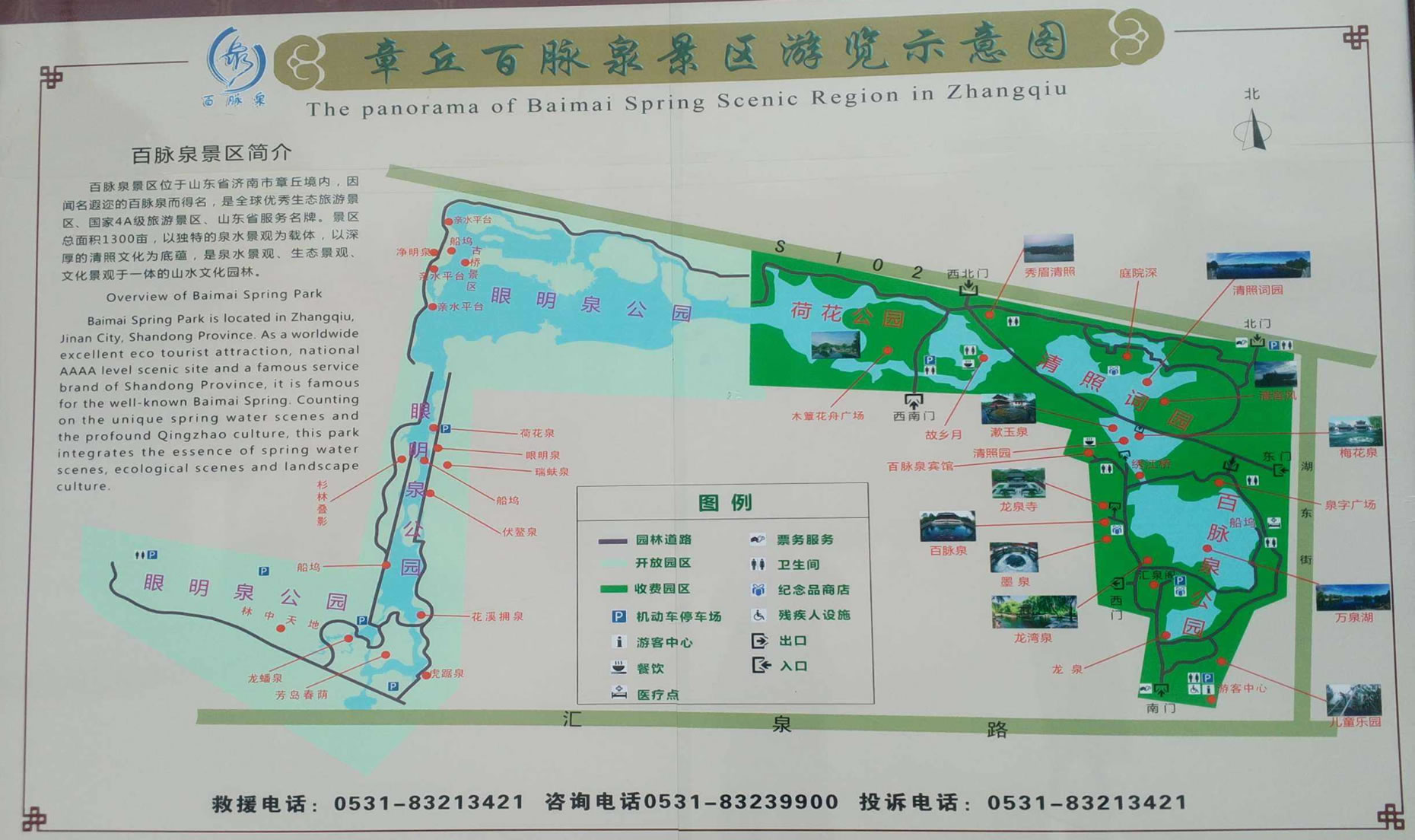 公園布局由著名園林專家孫筱祥先生設(shè)計(jì),園名由已故著名書法大師舒同題寫。園內(nèi)噴泉5處,石拱橋3座,石土假山2座,石、木板平橋、各一架。并建有匯泉閣、湖心亭、船塢碼頭等。公園景點(diǎn)布局因地緣勢(shì),順?biāo)飨颍鸫握归_,設(shè)計(jì)獨(dú)特,構(gòu)思巧妙。全園分為泉水、花園、幽靜學(xué)習(xí)、林蔭散步、兒童樂園5個(gè)區(qū)。泉水區(qū):奇花異草,千姿百態(tài)、鳥語花香,競(jìng)相斗艷。幽靜學(xué)習(xí)區(qū):環(huán)境幽雅,空氣清新,掩卷吟歌,浮想聯(lián)翩。密林散步區(qū):小橋流水,蜿蜒曲折,灌木叢生,暗柳成蔭。兒童樂園區(qū):游龍戲水,木馬滑梯,蕩秋千,跳蹦蹦床,高架橋,星空穿梭游藝機(jī),樂不思?xì)w。公園內(nèi)樓、臺(tái)、亭、榭、閣,點(diǎn)綴其間,錯(cuò)落有致,相互輝映。假山、密林、湖水、斷橋,別有洞天,可謂“疑是山窮水無路,柳暗花明又一景”。濟(jì)南七十二名泉中的百脈泉乃園中勝景,公園也因之得名。1997年5月,又在園西北隅建成清照罷工(李清照紀(jì)念館),公園風(fēng)光無限,更添春色。百脈泉公園是鑲嵌在章丘大地上的一顆明珠。百脈泉公園,位于山東省濟(jì)南市章丘區(qū)明水境內(nèi),這里是龍山文化的發(fā)祥地,一代詞宗李清照的故里。