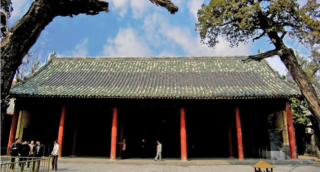 過大中門,即進入孔廟第四進庭院。院落疏闊,古樹蔥郁,禽鳥翔集夏天鸛飛鶴舞,白鷺翩翩,冬春鵲鳴雀喧,昏鴉噪晚,顯得十分幽深。