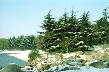 位于園東北,面積約1.33萬平方米。挖自盈湖的土大部堆積于此,形成丘陵起伏的地勢(shì),主峰高15米,山脈向西、向南延伸,呈直角放射狀,山體蜿蜒曲折。山間植雪松1750株,形成壯觀的雪松林帶,松濤陣陣,高聳挺拔,氣勢(shì)磅礴。一條石板小徑穿行林間,峽谷幽深,遠(yuǎn)離喧鬧。問樵亭建于中部,混合結(jié)構(gòu),面積16.4平方米。南部有只野牧亭,混合結(jié)構(gòu),面積16.4平方米。再向南過鋼筋混凝土橋與翠崖聽鸝相接。