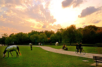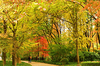 上海共青國(guó)家森林公園是以森林為主要景觀的特色公園,共種植200余種樹木,總數(shù)達(dá)30多萬株。公園分為南北兩園,北園占地1631畝稱為共青森林公園,南園占地239.6畝稱為萬竹園。南北園風(fēng)格各異,北園著重森林景色,有丘陵湖泊草地,南園則小橋流水一派南國(guó)風(fēng)光。除觀景之外,游人也可在園內(nèi)騎馬,燒烤和垂釣。