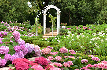位于綠蔭茶室東側(cè),占地6000余平米,集觀花、休閑于一身,設(shè)有品種展示區(qū)、觀景平臺(tái)、休閑平臺(tái)、木棧道等;▓@中心區(qū)域種植了30個(gè)品種近500余盆色彩繽紛的八仙花,如“無盡夏”、“夢(mèng)幻藍(lán)”、“紅粉佳人”等,結(jié)合白色的歐式拱門和落地盆景等,展現(xiàn)出浪漫的歐式風(fēng)情。而主入口處古樸的木亭、蜿蜒的旱溪和木質(zhì)棧臺(tái)等造景,又凸顯八仙花恬靜典雅之美。游客步入園中移步異景,從不同角度都能欣賞八仙花的風(fēng)姿卓絕。