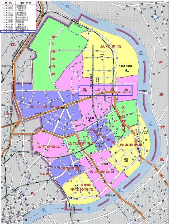 楊浦區(qū)轄12個街道:定海路街道、平?jīng)雎方值馈⒔致方值、四平路街道、控江路街道、長白新村街道、延吉新村街道、殷行街道、大橋街道、五角場街道、新江灣城街道、長海路街道