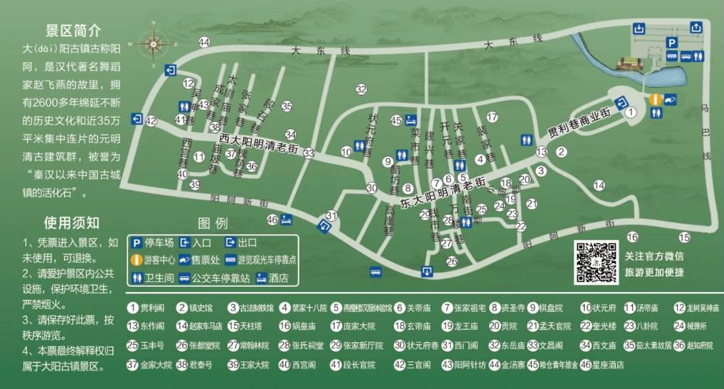 推薦路線:停車場——游客服務(wù)中心——貫利巷美食街——鎮(zhèn)史館——東作——古法制鐵館——小廟巷——玄帝廟——陽阿之源——械彈庫——老街——裴家巷——文化大院——開元巷——關(guān)帝廟——古樓巷(萬樓)——張都堂大院——錢市巷——張家老宅——建興巷(郜宅巷)老街——資圣寺——醋坊巷——棋盤院——狀元府巷——古陽阿縣門樓——返狀元府巷——傳統(tǒng)木作館——東岳廟——文昌閣——西大陽老街——文廟——湯帝廟——吳神巷——龍樹吳神廟