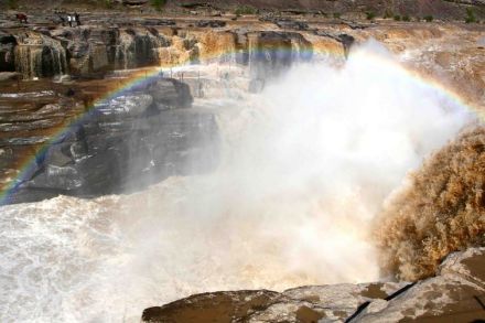 壺口瀑布反復沖擊所形成的水霧,升騰空中,使陽光發(fā)生折射而形成彩虹。彩虹有時呈弧形從天際插入水中,似長龍吸水;有時呈通直的彩帶橫在水面,象彩橋飛架,有時在濃煙騰霧中出現(xiàn)花團錦簇,五光十色,飄忽不定,撲朔迷離,為天下奇觀。