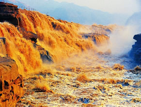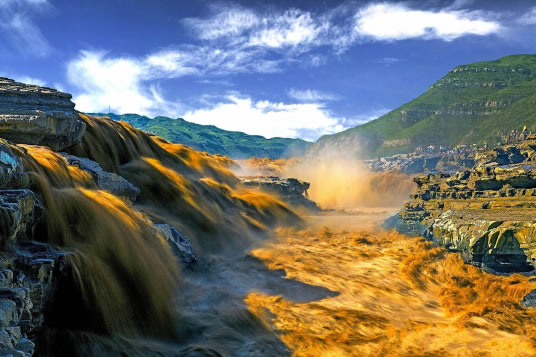 在高處河岸上,幾乎是看不到“龍槽”和黃河水流,只能看到紫褐色基巖河床中一線急騰翻卷的黃濁水塵和聽到轟鳴不息的奔騰濤聲。這槽中激流就象一鍋滾沸的水,左奔右奪,奔騰翻滾急下,激起的水霧彌漫在龍槽之上,使黃河在這里變得朦朦朧朧。每逢汛期黃河水漲時,洪水溢出壺口龍槽一端,龍槽東岸會出現(xiàn)一道一、二千米長的漫流水簾,十分壯觀。遠望龍槽,彎彎曲曲的峽中石槽,活象一條搖頭擺尾的巨龍,壺口是龍頭,一口吞沒黃河巨流。孟門是龍尾,腹泄河水于下游。