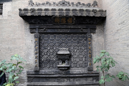 喬家大院大門坐西向東,為拱形門洞,上有高大的頂樓,頂樓正中懸掛著山西巡撫受慈禧太后面喻而贈送的匾額,上書“福種瑯環(huán)”四個大字。黑漆大門扇上裝有一對椒圖獸街大銅環(huán),并鑲嵌著銅底板對聯(lián)一付:“子孫賢,族將大;兄弟睦,家之肥!弊掷镄虚g透露著喬在中堂主人的希望和追求,也許正是遵循這樣的治家之道,喬在中堂經(jīng)過連續(xù)幾代人的努力,達到了后來人丁興旺、家資萬貫的輝煌。大門頂端正中嵌青石一塊,上書“古風”。大門對面的掩壁上,刻有磚雕“百壽圖”,一字一個樣,字字有風采。百壽圖為“在中堂”主人喬致庸的孫婿、近代著名學者、篆書家常贊春書寫。掩壁兩旁是清朝大臣左宗棠題贈的一付意味深長的篆體楹聯(lián):“損人欲以復(fù)天理,蓄道德而能文章。”楹額是“履和”。甬道的西盡頭處是雕龍畫棟的喬氏祠堂,與大門遙相對應(yīng)。祠堂裝點得十分講究,三級臺階,廟宇結(jié)構(gòu),以獅子頭柱,漢白玉石雕,壽字扶欄,通天欞門木雕夾扇。出檐以四條柱子承頂,柱頭有玉樹交榮、蘭馨桂馥、藤羅繞松的鏤空木雕。額頭有匾,上書“仁周義溥”四字,李鴻章所題。祠堂里原陳列著木刻精雕的三層祖先牌位。