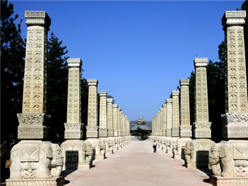 所謂禮佛大道:“恩澤普武周,慈航通法岸”。向西走去,十三對千佛列柱依次列于禮佛大道兩側(cè)。神柱高8.73米,系黃沙巖雕刻,由下而上依次為須彌座、力士、白象、柱體的完美組合,造型高聳、精致亙絕,在兩側(cè)濃密的松林掩映下,矗立的神柱氣勢雄偉、蔚為壯觀,仿佛通天入地,也仿佛唯有這樣的神柱鋪成的路才可以叫做禮佛大道。千佛列柱的原型在第9、10窟,第12窟,第14窟等處,均以大象、獅子等神物馱承,立體而又恢弘,呈現(xiàn)出平城時期北魏皇宮的恢弘模樣。