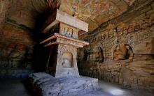 在風(fēng)化殘破的第14窟中,正壁為一佛二菩薩主像,除下層龕像為晚期補刻外,中上層龕像大致有計劃雕鑿。后室東西壁分作三層:上層以盝形龕交腳菩薩為主體,內(nèi)側(cè)有一小坐佛圓拱龕;中層為較大、較深的坐佛圓拱龕,龕外兩側(cè)為三層出檐閣樓塔;下層深龕仿佛雕刻了帷幔,東壁為坐佛,西壁龕內(nèi)未完成即被改刻。整個洞窟設(shè)計嚴謹、雕刻精美。