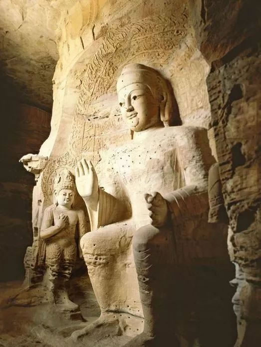 第19窟主佛像結(jié)跏趺坐,佛像耳輪齊肩,下頜崩毀,著袒右肩袈裟,輕薄貼體,衣紋簡潔明快。佛像右手舉胸施無畏印,左手掌心向上握法衣于膝上,以表達佛法的無畏與傳承?咄鈻|西耳洞中,各雕刻一尊倚坐佛像,西耳洞佛像,耳廓寬大垂肩,體魄挺拔勁健。這種分窟安置三世佛的布局設(shè)計,既有變化,又顯莊嚴,是北朝石窟形制的新創(chuàng)舉。