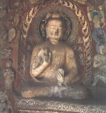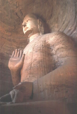早期石窟:即今第16~20窟,亦稱為曇曜五窟。根據(jù)《魏書·釋老志》(卷114)記載:“和平初,師賢卒。曇耀代之,更名沙門統(tǒng)。初,曇耀于復(fù)法之明年,自中山被命赴京,值帝出,見于路,御馬前銜耀衣,時人以為馬識善人,帝后奉以師禮。曇曜白帝,於京城西武州塞,鑿山石壁,開窟五所,鐫建佛像各一,高者七十尺,次六十尺,雕飾奇?zhèn),冠于一世。”文中記述的開窟五所,就是當(dāng)時著名的高僧曇曜就選擇了鐘靈毓秀的武州山,開鑿了雄偉壯觀的曇曜五窟,揭開了云岡石窟開鑿的序幕。第16~20窟即帝王象征的曇曜五窟,以造像的風(fēng)格和創(chuàng)作的技法來看,是云岡全窟群中最早的五個窟。平面為馬蹄形,穹隆頂,外壁滿雕千佛。主要造像為三世佛(過去、現(xiàn)在、未來),佛像高大,面相豐圓,高鼻深目,雙肩齊挺,顯示出一種勁健、渾厚、質(zhì)樸的造像作風(fēng)。其雕刻技藝繼承并發(fā)展了漢代的優(yōu)秀傳統(tǒng),吸收并融合了古印度犍陀羅、秣菟羅藝術(shù)的精華,創(chuàng)造出具有獨特的藝術(shù)風(fēng)格,這是中外融合所形成的新的藝術(shù)風(fēng)格。