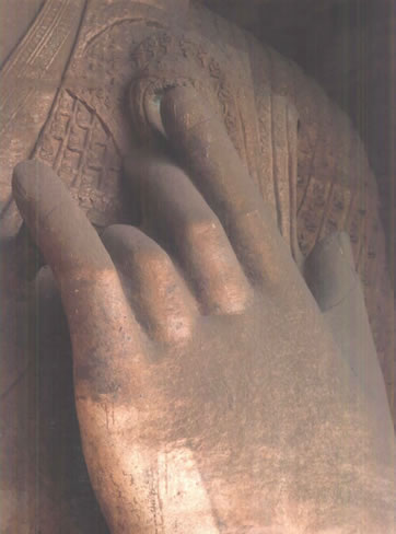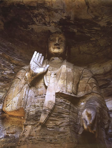 大佛兩側(cè),原本各有立佛、立菩薩,呈三世佛、五尊像布局,可惜今天僅有東壁一佛獨立。東立佛高約9.5米,磨光肉髻,圓臉大耳,深目高鼻,著通肩式佛衣;右手舉在胸前,施無畏印,左手握衣角下垂,跣足立于蓮臺之上。其衣紋雕刻與造像特征,極具西域藝術(shù)神韻。西壁立佛,大約當(dāng)年與東立佛相對侍立,但早已坍塌無形,現(xiàn)在僅殘留圓形頭光和赤裸的雙足及其蓮臺。