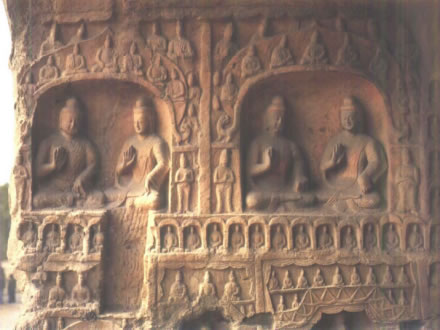 第8窟前室北壁上開明窗,下鑿窟門,壁面風(fēng)化嚴重。前室西壁雕千佛及供養(yǎng)人,但均風(fēng)化嚴重?zé)o存。東壁雕刻佛本生故事以及供養(yǎng)人,但因風(fēng)化嚴重不可辨認,下層北側(cè)有一拱門與第7窟相通。