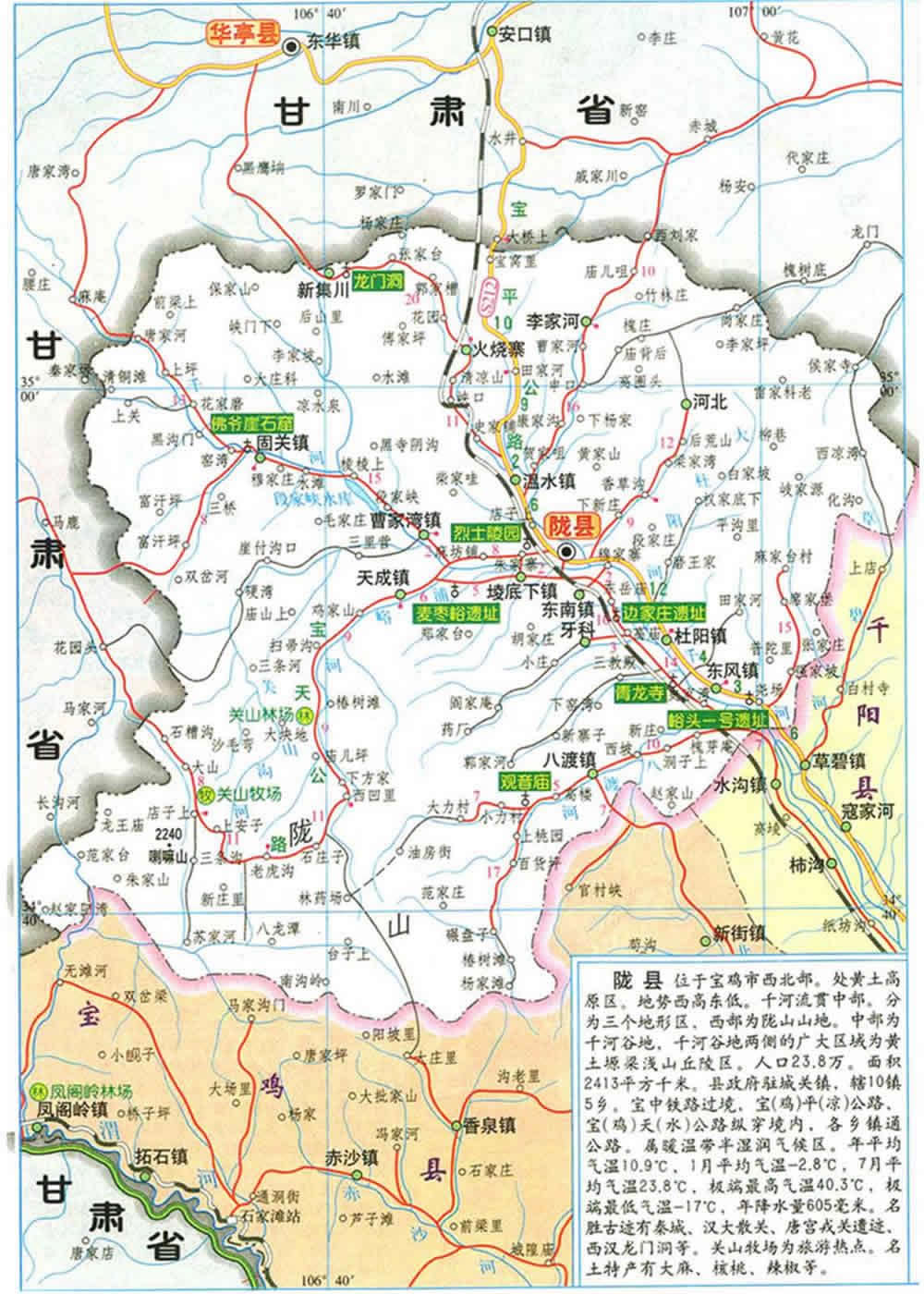 隴縣,史稱隴州,因地處隴山東阪而得名,是陜西省西部的一個邊陲縣。東臨千陽,南接陳倉,西北部與甘肅清水、張家川、華亭、崇信、靈臺五縣毗鄰。版圖面積 2418平方公里,轄10鎮(zhèn)5鄉(xiāng)1個管委會,158個行政村,1000個村民小組,總?cè)丝?5.03萬,其中農(nóng)業(yè)人口22.27萬。寶中鐵路和204省道貫穿全境,為陜、甘、寧“三省通衢”和邊貿(mào)重鎮(zhèn)。