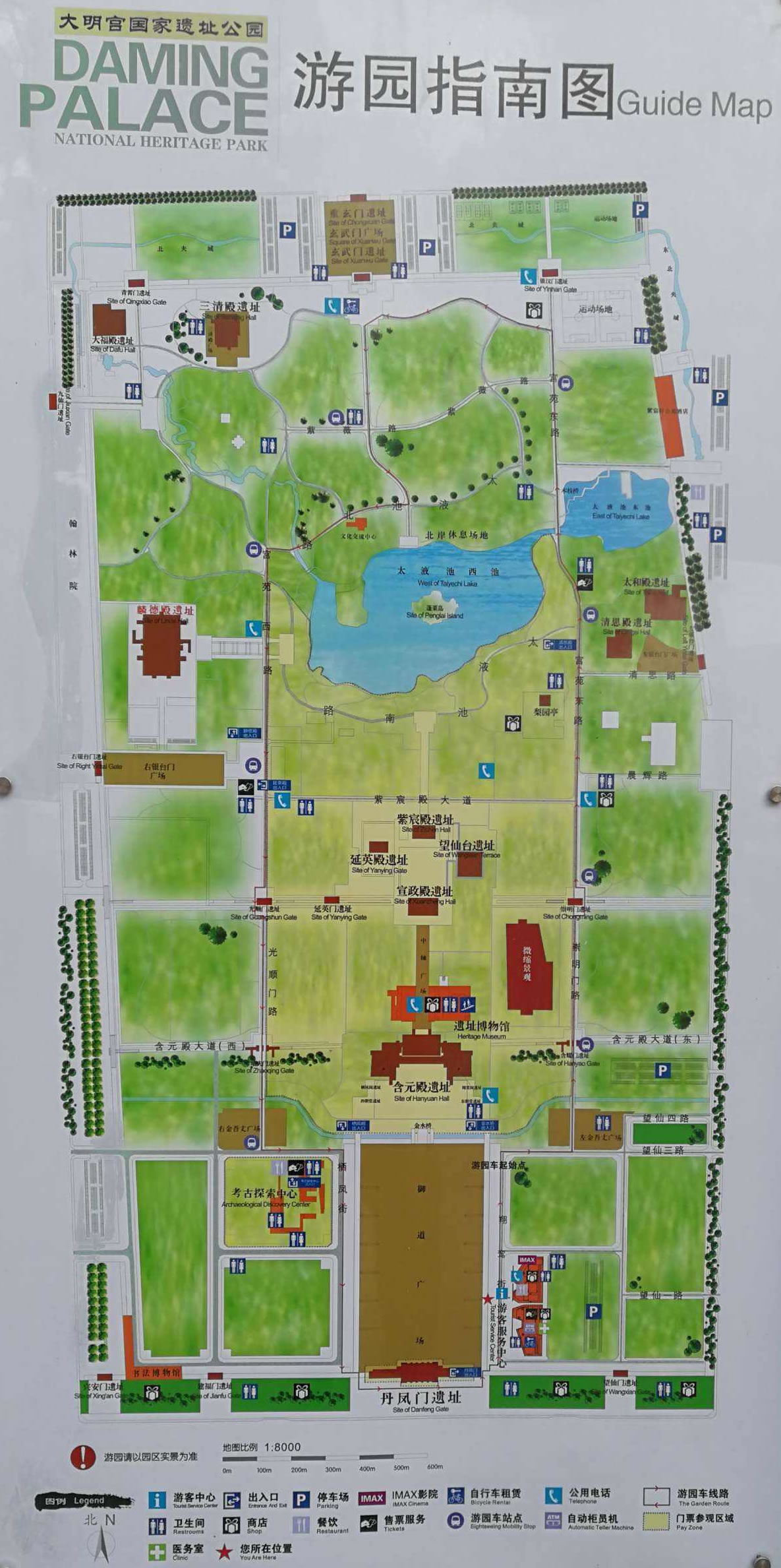 大明宮國(guó)家遺址公園延續(xù)唐代大明宮的歷史格局,由南向北沿丹鳳門(mén)—含元殿—宣政殿—紫宸殿—玄武門(mén)—重玄門(mén),為中軸線,分為殿前區(qū)、宮殿區(qū)、宮苑區(qū)三大區(qū)域。