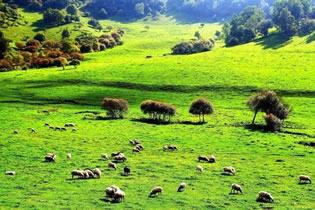 群山競(jìng)秀,溪壑密布,林木參天,草場(chǎng)綿延不絕。森林沿圓潤柔和的山體從上到下呈放射狀分布,與廣闊肥腴的草原相間,形成了獨(dú)特的地理形態(tài)。組成草原的山巒重重疊疊,蜿蜒起伏,和舒緩寬闊的山谷坡地密切銜接,延綿不斷。幽澗水澤穿行于腹地,或囤積成片分布在大大小小的草坡上,或森林間,使得草原地面表層常年濕潤無比。春秋季節(jié),游人絡(luò)繹不絕的蜂擁而至,踩在青翠碧綠的草面上,常會(huì)為被地表的柔軟和從鞋子周圍緩緩溢出的水感到驚訝。由于受垂直地帶性地理?xiàng)l件的影響,終年氣溫較低,春秋相連,冬長無夏,素有“關(guān)山六月猶凝霜”的寫照。因其地貌酷似中歐的阿爾卑斯山,故有些旅游資料上稱其是“具有歐式風(fēng)情的游覽勝地”。