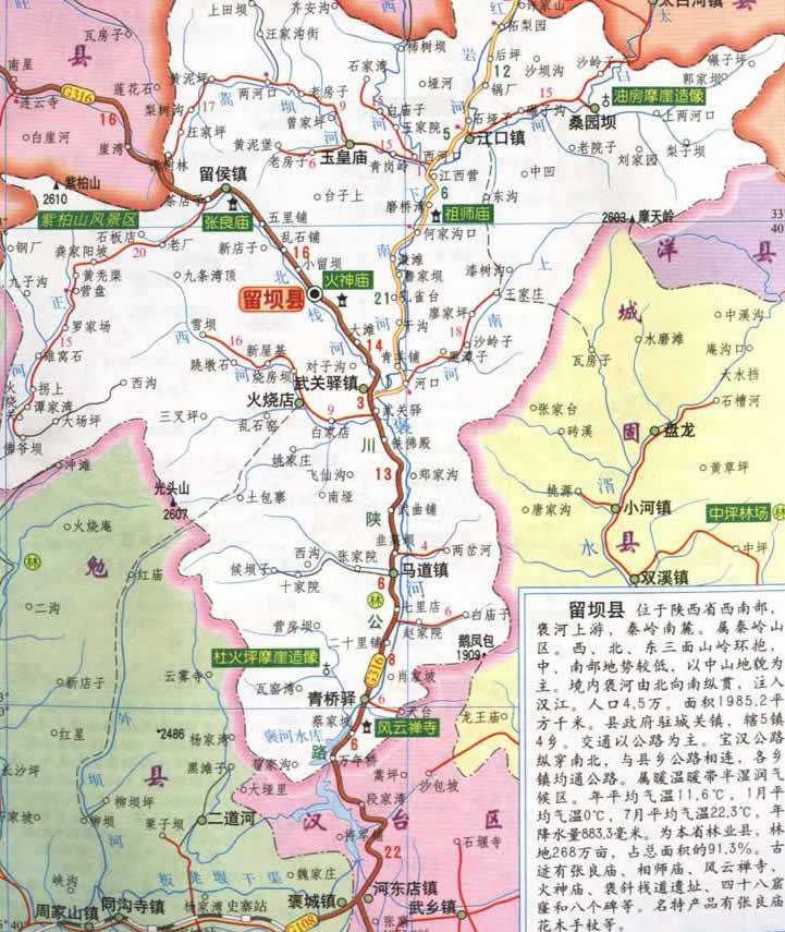 留壩縣地處秦嶺南麓,漢江上游,“面巴蜀而背秦川”,屬亞熱帶濕潤季風(fēng)氣候區(qū),夏無酷暑,冬無嚴(yán)寒,生態(tài)環(huán)境優(yōu)越,地質(zhì)地貌特征獨具特色,歷史文化積淀豐厚,自然景觀與人文景觀交相輝映,蘊藏著極其豐富的旅游資源。