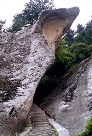 “通天亭”,因和山頂金鎖關(guān)通天門遙遙相對,所以叫“通天亭”,從這兒出玉泉院,“自古華山一條路”就從大家腳下開始沿伸,全長25華里,共有9567個臺階,沿途各位可以看到迷人的風(fēng)光山色,誘人的驚險神道。