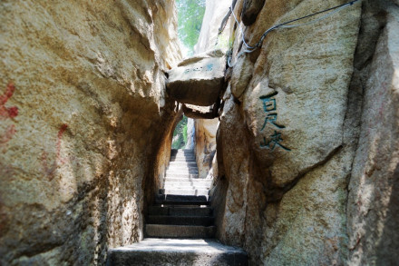 南天門石坊至朝元洞西,路依崖鑿出,長20米,寬二尺許,為上段。