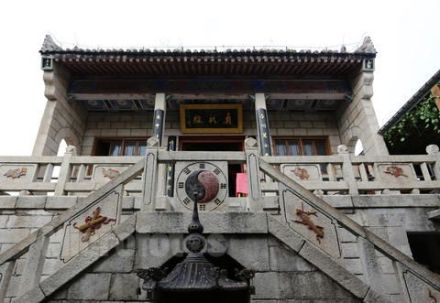 穿過這段長廊,就來到了玉泉院的主體建筑部分--大殿,它分前殿和后殿兩大部分,前殿供奉的是道教華山派的創(chuàng)始人——郝大通,殿外立了許多碑,有歷代名人歌頌華山詩碑,華山全圖碑和宋代書法家米芾的“第一山”,門楣上“古松萬年”為光緒皇帝所題。在這部分,是道師們每到道教節(jié)日,做道場和慶祝的地方,后殿供奉陳摶的坐像,門楣兩邊有兩幅畫,左面一幅是趙匡胤與陳摶下棋賭華山畫面,位置在華山東峰,左面是五龍駕陳摶來華山,這幅畫告訴大家,陳摶是怎么到華山的。
