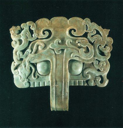 橫寬36.5厘米,灰綠色,下有凸鈕,四角略弧圓,分別碾琢其時流行的青龍、白虎、朱雀、玄武四神像。器物下方以環(huán)鈕為鼻梁,上連粗眉和暴起雙眼,形成大獸面,下緣則以8條豎紋勾勒出寬大的排牙。圖案化的形象莊嚴(yán)凝重,工藝精美,線條運(yùn)用剛?cè)嵯酀?jì)。