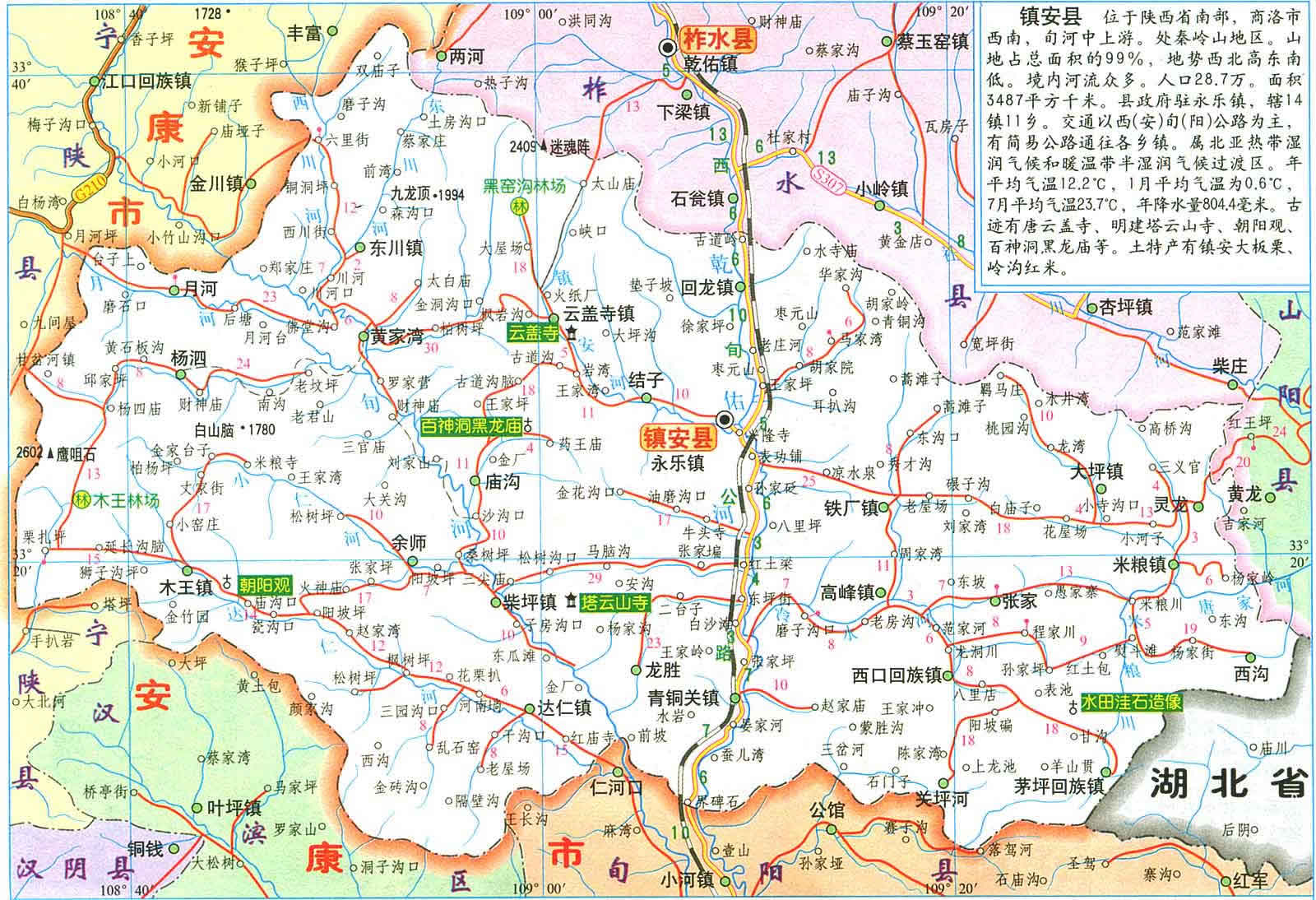 鎮(zhèn)安縣位于陜西省東南部,秦嶺南麓,商洛市西南,位于漢江支流乾佑河與旬河中游,北到北緯33°48′57″與柞水縣相連,南到北緯33°8′44″與旬陽(yáng)縣、安康市接壤,西到東經(jīng)108°34′16″與寧陜縣相鄰,東到東經(jīng)109°36′55″,與山陽(yáng)縣和湖北省鄖西縣相交。東西長(zhǎng)175.5km,南北寬72.5km,全縣國(guó)土總面積約為3487km2,全縣有205個(gè)行政村,3個(gè)社區(qū),1060個(gè)村民小組,第五次人口普查資料顯示:2000年11月1日0時(shí),戶籍總?cè)丝跒?9萬(wàn)零138人(包括外出務(wù)工人口不包括外來(lái)人口)。