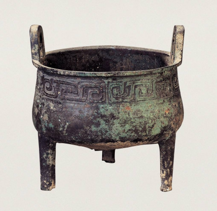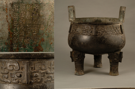 鑄于周康王時期,造型敦厚雄偉,紋飾莊重神奇。通高77厘米,口徑56.5厘米。立耳,深腹,平沿方唇,三柱足?谘叵嘛椄〉駹铟吟鸭y,地襯細雷紋。三足根部飾大饕餮面。雙耳外側(cè)各飾一條曲體上緣的夔龍。腹外壁及底部厚積煙跡,顯系長期使用所致。腹內(nèi)壁鑄有銘文28字。旟鼎承襲商代圓鼎風(fēng)格,造型厚重莊嚴,紋飾十分精美,所刻銘文是研究周初土地制度的重要史料,具有珍貴的歷史及藝術(shù)價值,加之鑄刻時代明確,被公認為周康王時的標準器,是一尊著名的西周時期的國寶。
