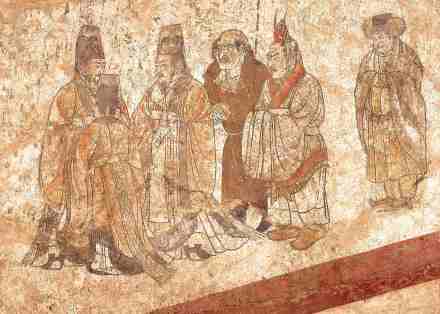 高185厘米,寬247厘米。繪于章懷太子墓道東壁。畫面中共有六位人物,前三位是唐朝鴻臚寺官員,均著初唐朝服,頭戴籠冠,身穿闊袖紅袍,白裙曳地,腰系綬帶,手持笏板,足登朝天履,呈三角狀站立。三人氣度沉穩(wěn),雍容自如,神情肅穆,面面相對,似乎正在商討事宜。后面三位,為首一人推斷應(yīng)是來自東羅馬的使節(jié)。中間一人推斷是來自朝鮮半島的新羅使節(jié)。最后一位應(yīng)來自中國東北靺鞨族。這三位使者均躬身,畢恭畢敬,謙卑的神情中流露出期盼、等待之意。