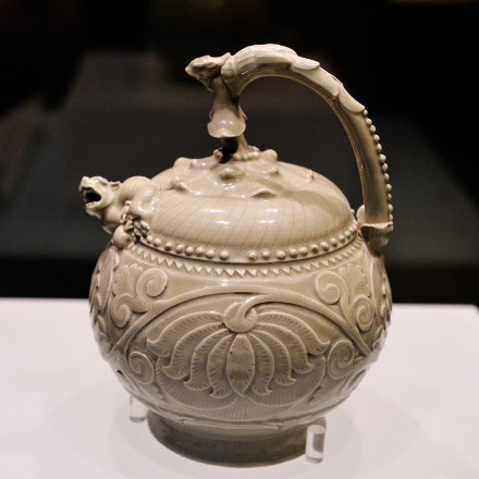 這件提梁倒灌壺是著名的耀州窯(窯址在今陜西省銅川市王益區(qū)黃堡鎮(zhèn))產(chǎn)品。耀州窯是唐宋時中國北方名窯,時人推崇耀瓷“巧如范金,精比琢玉”。此壺造型古樸典雅,制作規(guī)整精細,紋紋繁褥華麗,尤其是構(gòu)思奇特,設(shè)計巧奪天工,被認為是國內(nèi)外存世耀州窯瓷器中最為精美的一件。