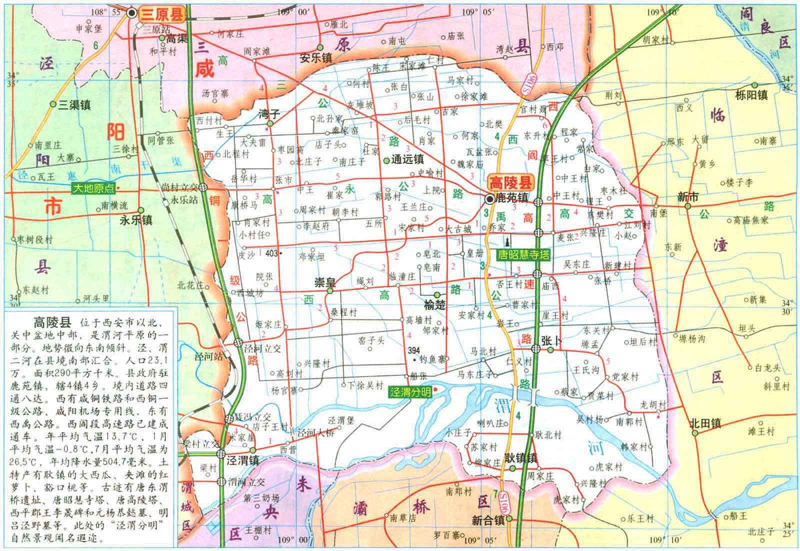 高陵縣地處陜西省關(guān)中平原腹地,位于西安市轄域北部。全縣轄4鎮(zhèn)4鄉(xiāng),88個(gè)行政村,740個(gè)村民小組?偯娣e294平方公里,每平方公里人口密度約950人??cè)丝?8萬(wàn)人,其中非農(nóng)業(yè)人口11.9萬(wàn)。