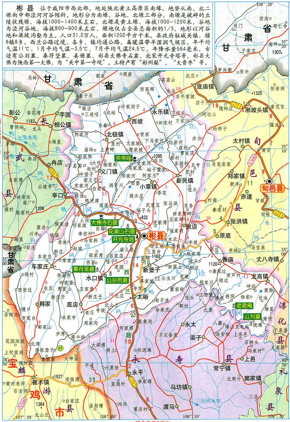 彬縣位于陜甘兩省交界處,南距咸陽120公里、西安150公里,北距甘肅平?jīng)?60公里,是連接秦隴的咽喉要道。全縣版圖形似正寫的“人”字,涇河自西而東斜貫其中,將全縣分為南北兩塬一道川。全縣轄8鎮(zhèn)8鄉(xiāng)246個行政村,總人口32萬,其中農業(yè)人口28.8萬,總面積1183平方公里,耕地面積60萬畝。彬縣歷史悠久,是中國古代農業(yè)的發(fā)祥地之一。