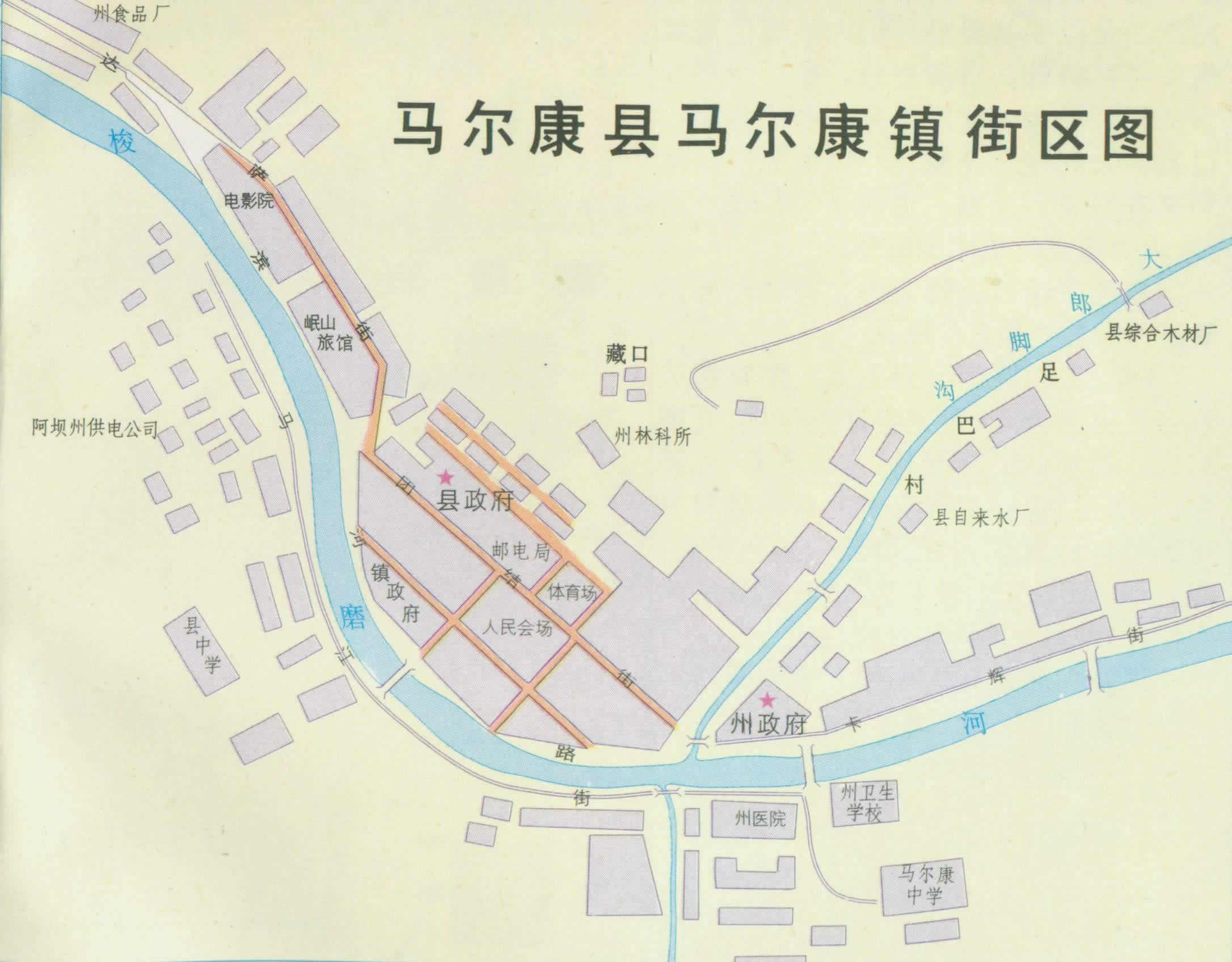 1953年4月,經(jīng)政務(wù)院批準(zhǔn)設(shè)立四川省藏族自治區(qū)馬爾康辦事處。1956年4月國務(wù)院批準(zhǔn)正式建立了馬爾康縣。1990年底,全縣轄1鎮(zhèn)、13鄉(xiāng)、104個(gè)村、230個(gè)村民小組?h人民政府駐馬爾康鎮(zhèn)。馬爾康鎮(zhèn)亦是州人民政府駐地,距省會(huì)成都395公里。