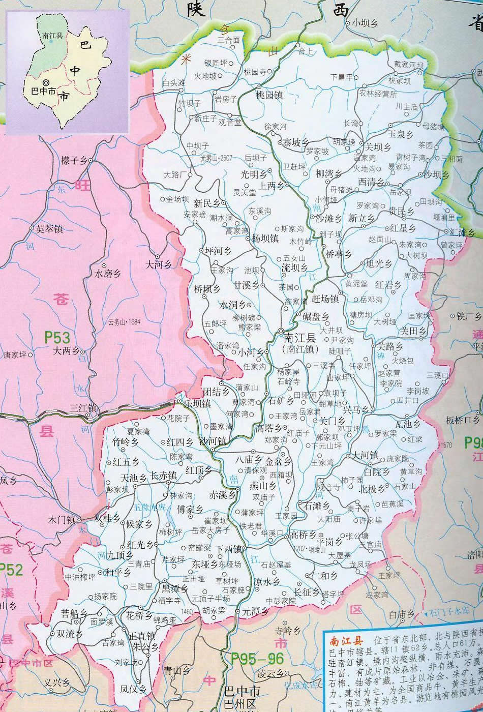 南江縣位于四川北緣米倉山南麓,東鄰?fù)ń,南接巴州,西界旺蒼,北靠陜西省南鄭縣。南江古屬巴國,后為集州,先秦兩漢就有政區(qū)建置。南北朝時(shí)期的梁普通六年(公元525年)始建難江縣(取江水難涉之意),距今1480年,明正德十一年(公元1516年)改難江縣為南江縣(江水繞城南而名)至今。 幅員面積3383平方公里,有耕地42.3萬畝;總?cè)丝?5萬人,總戶數(shù)20.2萬戶。全縣轄48個(gè)鄉(xiāng)鎮(zhèn),522個(gè)村,2408個(gè)村民小組,86個(gè)居民委員會(huì)。