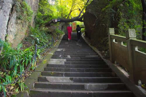 從竇圌山牌坊開始,是一條通往山頂?shù)牟叫惺荨ㄌ斓馈Mㄌ斓篱L513米,806級石梯,垂直高差63米,俊俏瀟灑,直指云端。