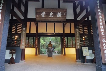 詩史堂是中軸線上的第三重建筑,也是主體建筑。杜甫留下的1400多首詩歌,真實(shí)而生動(dòng)地展現(xiàn)了“安史之亂”前后唐代社會(huì)生活畫卷,反映了唐朝由盛轉(zhuǎn)衰的歷史。杜甫被后世尊為“詩圣”,他的詩歌被稱為“詩史”, “詩史堂”也因此得名。大廳的正中陳列著一尊由我國著名雕塑家劉開渠先生以寫實(shí)的手法來刻畫的杜甫塑像。
