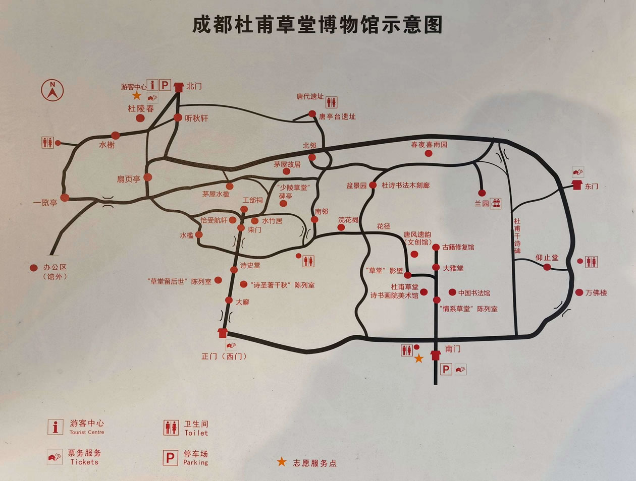 博物館按功能區(qū)分為:文物景點(diǎn)游覽區(qū)(草堂舊址)、園林景點(diǎn)游覽區(qū)(梅園)和服務(wù)區(qū)(草堂寺)。草堂舊址內(nèi),照壁、正門、大廨、詩史堂、柴門、工部祠排列在一條中軸線上,兩旁配以對(duì)稱的回廊與其它附屬建筑,其間有流水縈回,小橋勾連,竹樹掩映,顯得既莊嚴(yán)肅穆、古樸典雅而又幽深靜謐、秀麗清朗。工部祠東側(cè)是“少陵草堂”碑亭,象征著杜甫的茅屋,已成為杜甫草堂的標(biāo)志性景點(diǎn)和成都的著名景觀。
