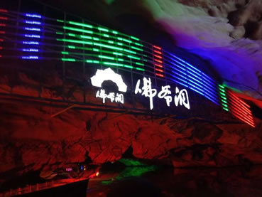 由南天門往右,沿著崎嶇的“盤陀路”進入第二殿,隨著“一柱廳”、“半天山”到達約有450平方米寬的“東海龍宮”那里“定海神針”直立,“五彩神泉池”水色清澈晶瑩,不寒而栗有“白龍越江奪寶”、“頑猴望”、“海獅戲蓮”、“別甲神鷹鎮(zhèn)金沙”、“龍王百寶箱”等天然造型,氣勢磅礴,極為壯觀。龍宮內(nèi)洞中有洞、景中有景!拔淞陥@”有牛角尖、簸箕天,海螺洞中有“鶴蚌相爭”、“海螺觀戰(zhàn)”、“鳴鑼助戰(zhàn)”、“石床”等石筍、鐘乳石造型,相映成趣,目不暇接。然而,“山有洞天不算奇,陰河劃船數(shù)第一”。沿著灣灣曲曲的跳蹬路,耳聽潺水聲,觀看“地海橫鯨”、“青蛙駝蓮”、“天地桃”、“美猴照鏡”等景點來到陰河劃船處——“凱旋門”、只見幽幽碧水,微泛漣漪,各種燈光倒映水中的燈景冉冉浮動。