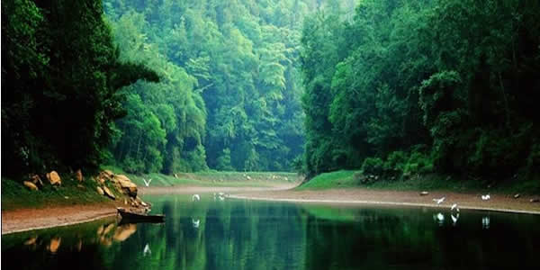 (4)象鼻河 象鼻河位于回龍湖尾段,經岳池縣城出發(fā)車行至天平鎮(zhèn)回龍湖坐船可到,河長約四公里。因河端有一小山,形態(tài)奇特,遠望酷似大象的鼻子,所以這條河就叫象鼻河。象鼻河寬五六丈,象一顆長寶石鑲嵌在兩岸的高巖之間。象鼻河西側有雞頸坳和庵堂坡相互攀比,各自把山巖泉水盡量拋出。飛瀑直下,銀花四濺,疑是仙人,丟下白練。兩岸樹木,青翠欲滴,藤繞山石,鳥戲其間,蜂飛蝶舞,何等悠然。乘舟慢進,有山風習習,涼爽撲面。清澈河水,擁抱船板,發(fā)出咕咕細語,情意綿綿。上游涌來清流,與河水交融,握手言歡。游魚競技,爭先恐后,其樂融融,游人贊嘆。“青山之中藏小河,木船水頭蕩清波。有人興起一聲吼,魚逃鳥飛野兔躲。誰說人間無仙境?不信請來象鼻河。”象鼻河匯入的回龍湖鑲嵌在兩岸直壁芳草如茵的群山之中,這里水面遼闊,一碧如玉;湖上輕舟飛蕩,魚歌陣陣,銀鱗競躍,水鳥爭翔,陰雨時山色空 蒙,晴天里滿目蒼翠,是川東的又一西子湖。湖邊近500畝的名優(yōu)水果和各種反季節(jié)果類,更是錦上添花。