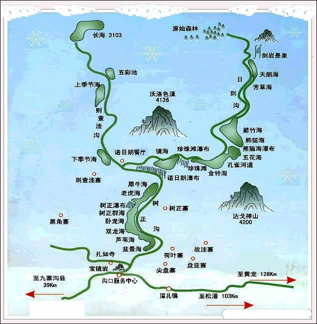 九寨溝國(guó)家級(jí)自然保護(hù)區(qū)地勢(shì)南高北低,山谷深切,高差懸殊,區(qū)北緣九寨溝口海拔僅2000米,中部峰嶺均在4000米以上,南緣達(dá)4500米以上,主溝長(zhǎng)30多千米。峰頂和兩側(cè)山峰基本終年積雪。九寨溝地處青藏高原向四川盆地過渡地帶,地質(zhì)背景復(fù)雜,碳酸鹽分布廣泛,褶皺斷裂發(fā)育,新構(gòu)造運(yùn)動(dòng)強(qiáng)烈,地殼抬升幅度大,多種營(yíng)力交錯(cuò)復(fù)合,造就了多種多樣的地貌,發(fā)育了大規(guī)?λ固刈饔玫拟}化沉積,以植物喀斯特鈣華沉積為主導(dǎo),形成九寨溝艷麗典雅的群湖,奔瀉湍急的溪流,飛珠濺玉的瀑群,古穆幽深的林莽,連綿起伏的雪峰。